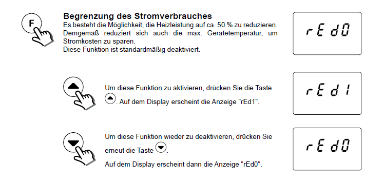Mit der Funktion Stromverbrauchsbegrenzung können Sie die Heizleistung per Tastendruck auf ca. 50 % reduzieren. Dadurch sinkt auch die Oberflächentemperatur – eine ideale Sicherheitsfunktion in Haushalten mit Kindern oder älteren Menschen.